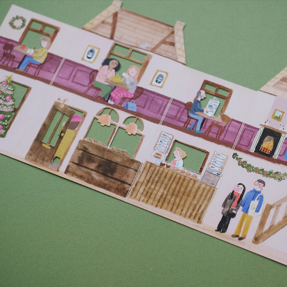 - Buitenkant met bakkerij-exterieur en een gezellig interieur aan de binnenkant: kerstboom, krans en verschillende mensen die warme drankjes drinken.